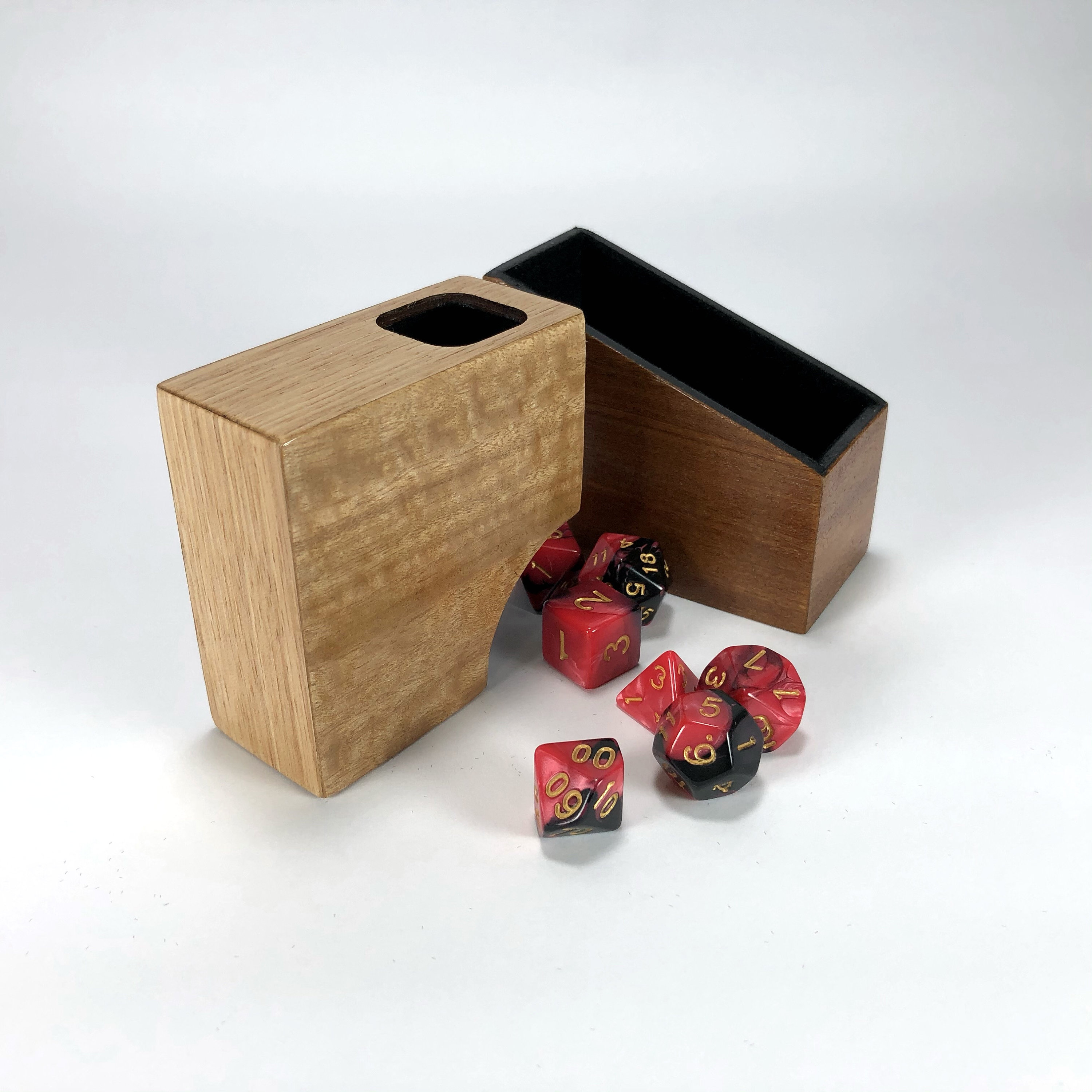 This miniature dice tower is sure to catch the eye of even the most discriminating beholder. Made from Baltic Birch laminate and hardwood veneer with flocking inside the cover. Designed to hold your dice on the go with the included silicone band, this compact tower is small enough to take anywhere no matter how cluttered your bag of carrying is.