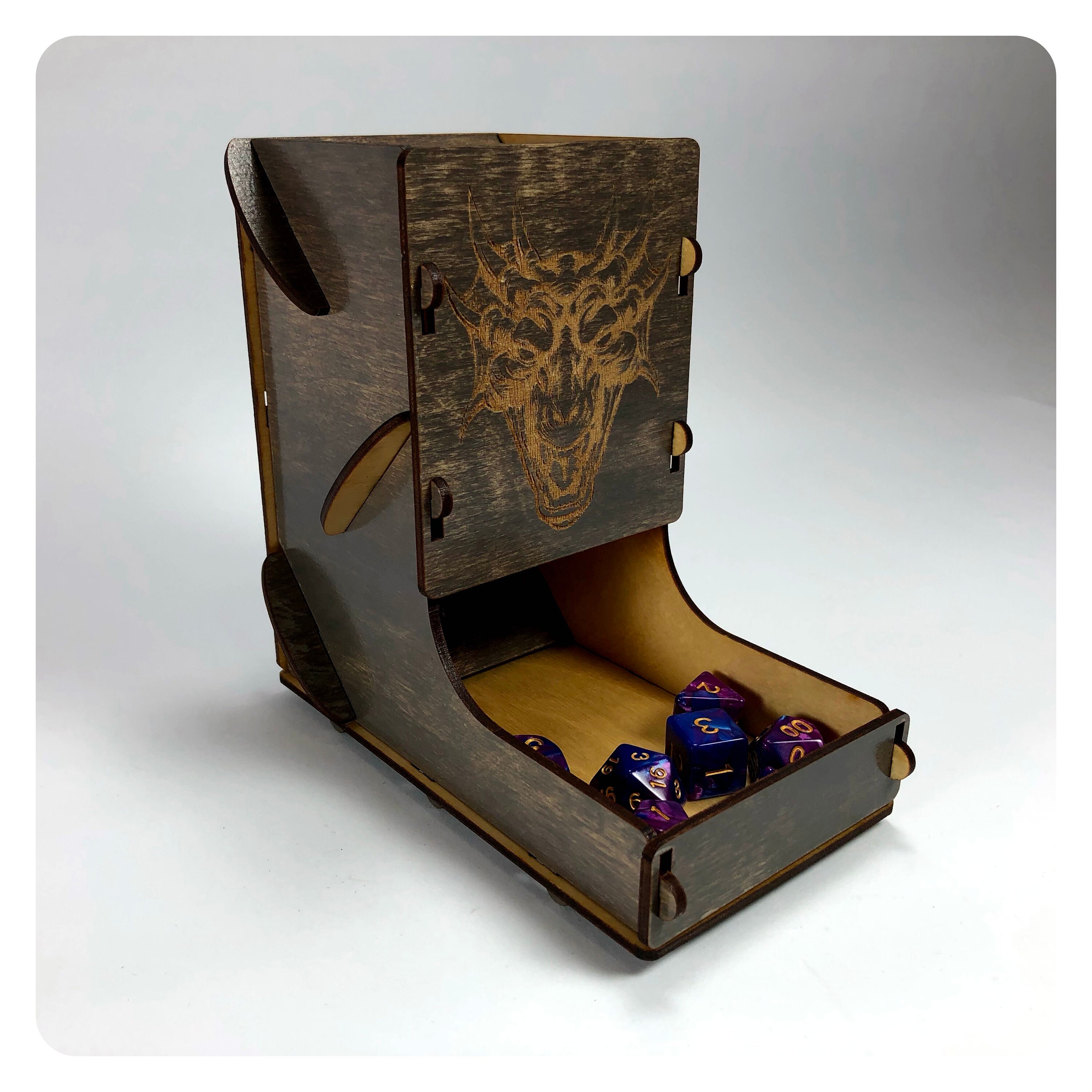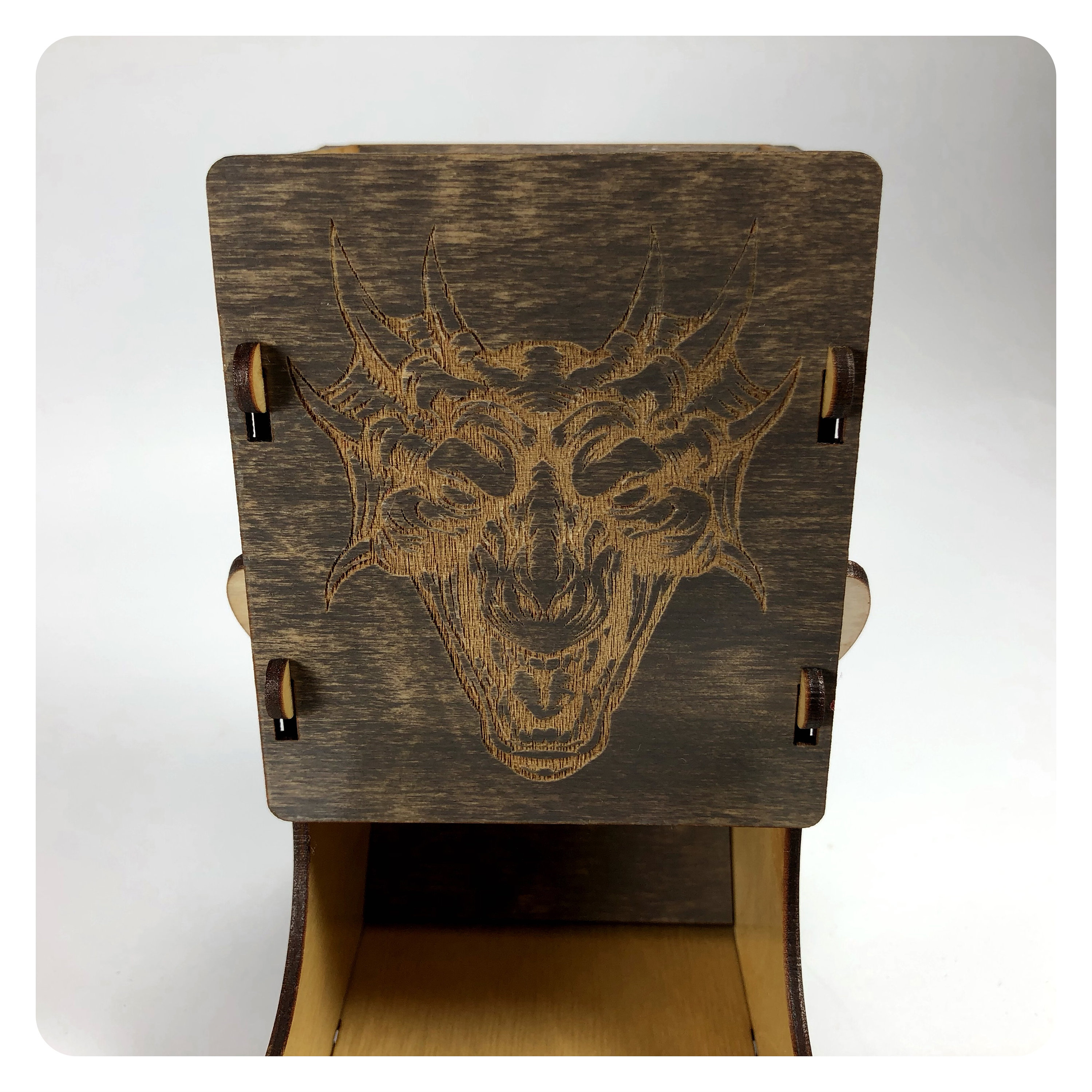 This laser cut and engraved Baltic Birch dice tower is great for gamers on the go. Takes seconds to assemble or break down!