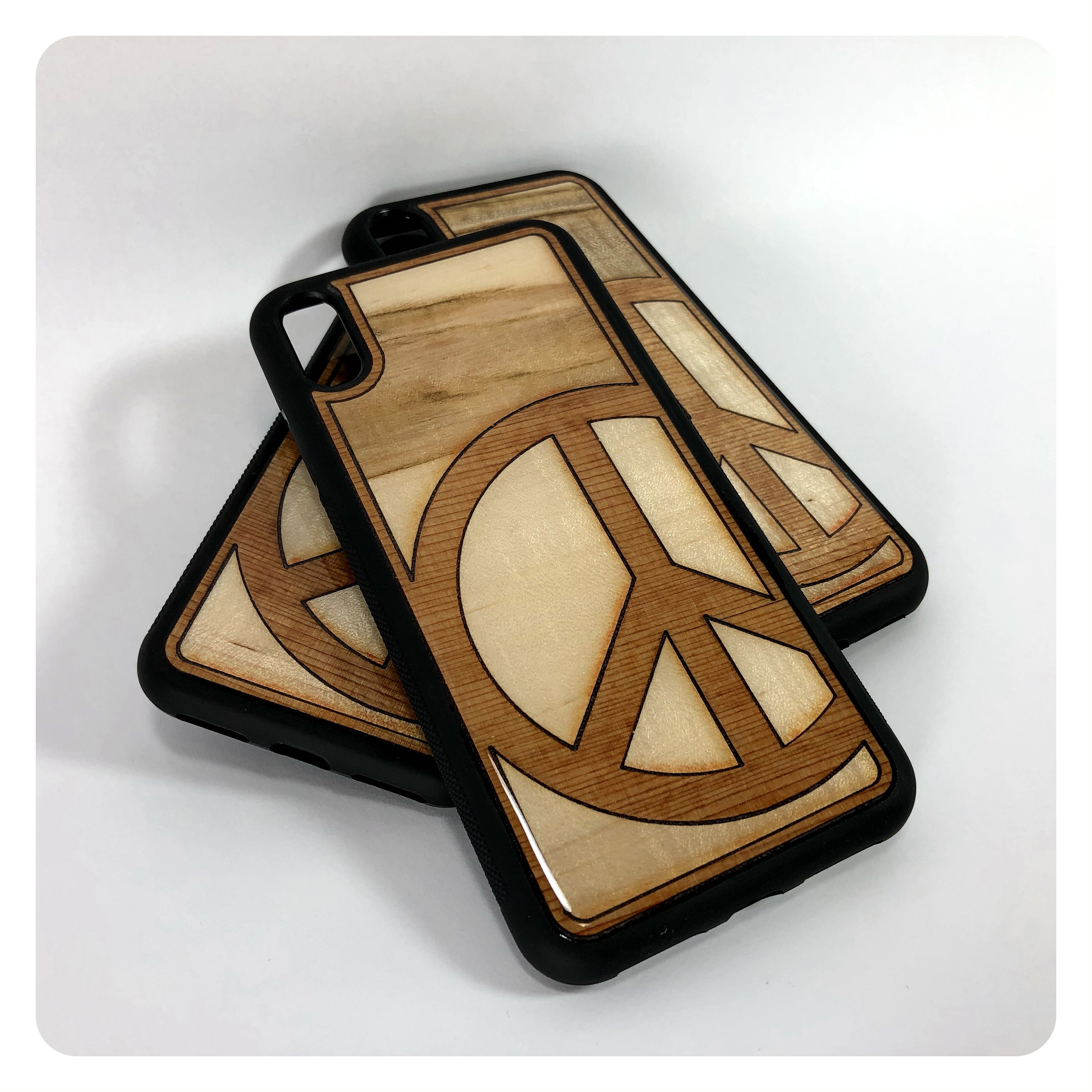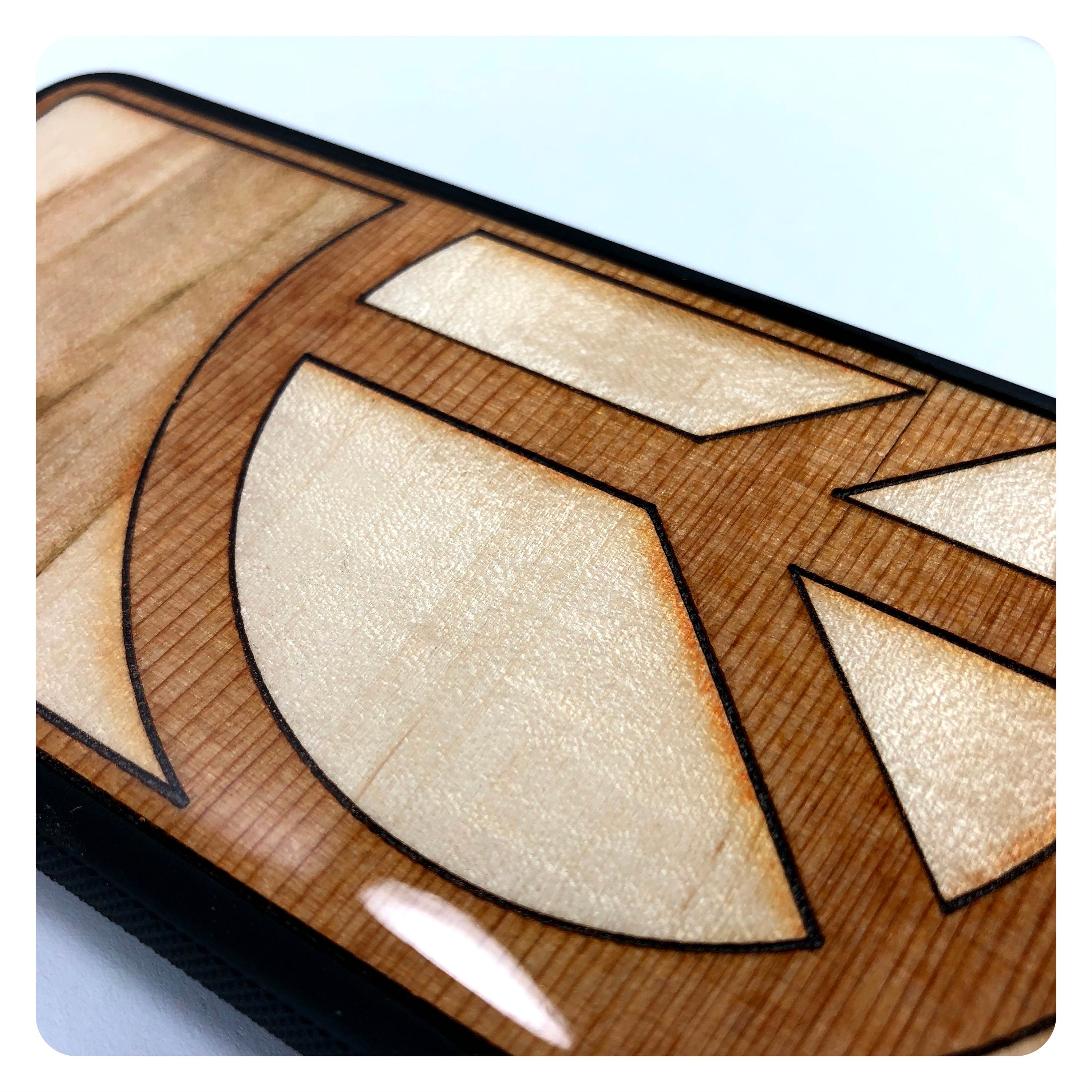 This black rubber case is inlayed with high quality hardwood veneer and sealed with a thick layer of resin for durability and maximum luster. The rubber case has a small lip that keeps your phone's screen from touching the surface it's sitting on when face down.
