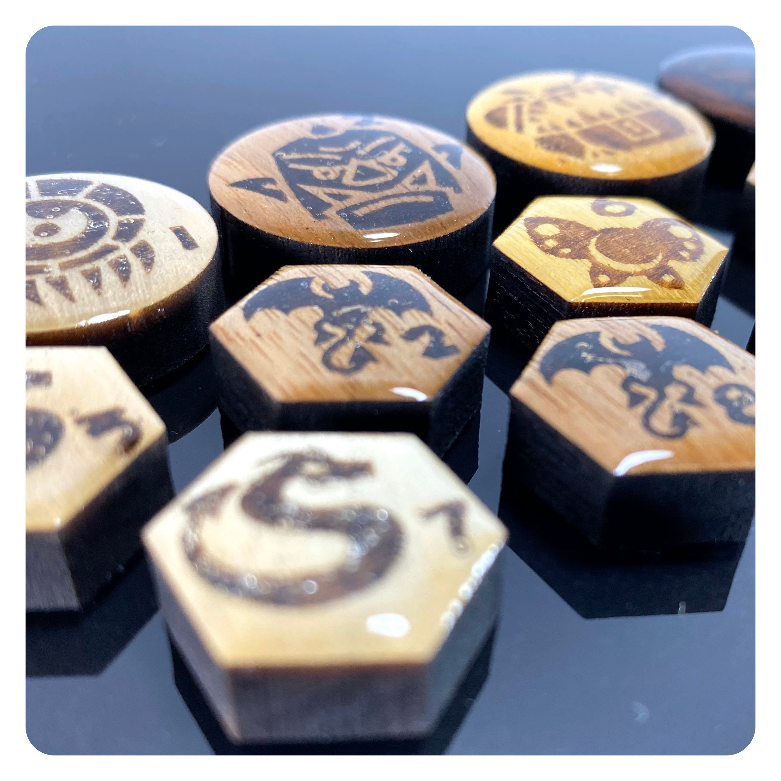 Tiny tokens measure approximately 1/2” and Small/Medium tokens measure just under 1” making them compatible with any 1” grid mat/map.
